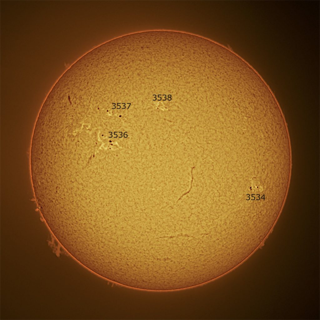 黒点群「3537」右側の明るい部分は「3538」の番号が振られ、本日は4群の確認が可能です