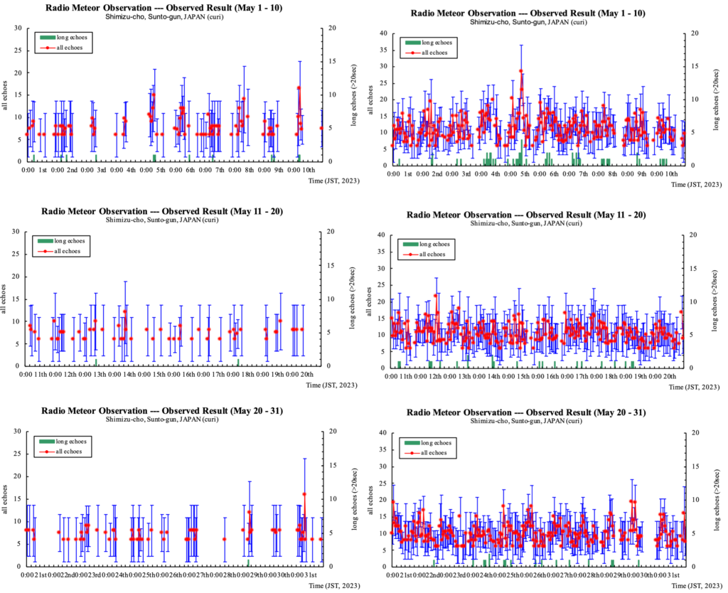 5/5頃に受信数/ロングエコー共にかなりの反応が見られ、6日明け方に極大となるみずがめ座η流星群由来なのかなぁと考えています